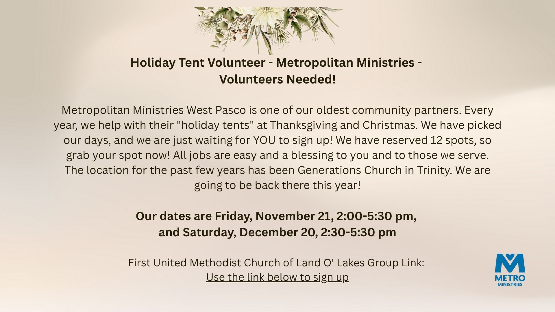 Metropolitan Ministries West Pasco is one of our oldest community partners. Every year, we help with their “holiday tents” at Thanksgiving and Christmas. We have picked our days, and we are just waiting for YOU to sign up! We have reserved 12 spots, so grab your spot now! All jobs are easy and a blessing to you and to those we serve.